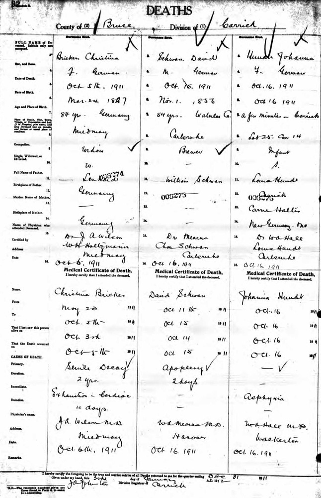 Dr. J. A. Wilson signed Christina's death certificate. Moses had preceded Christina in 1894. Christina passed on October 5, 1911. Dr. Wilson listed her primary cause of death as "Senile Decay" and her immediate cause as "Exhaustion - Cardiac."