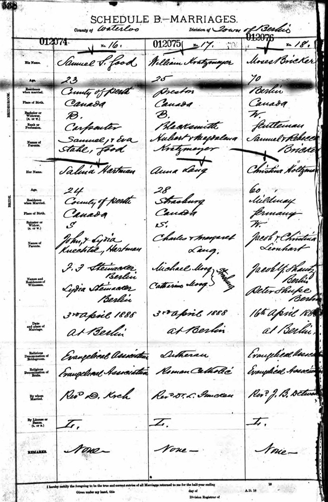 Henry, 9 years older than Christina, passed in 1881. Christina married Moses Bricker on April 16, 1888. He was 70; she was 60. Moses' occupation was "Gentleman." Both listed their religion as Evangelical Association.