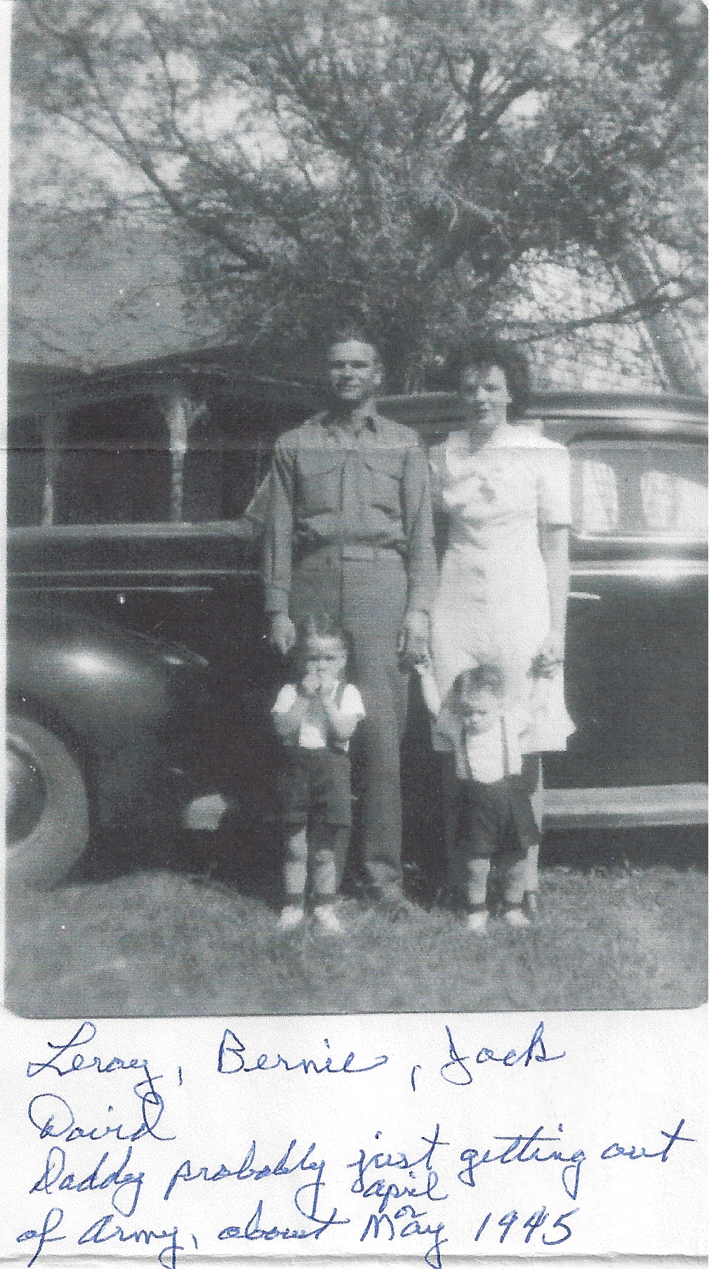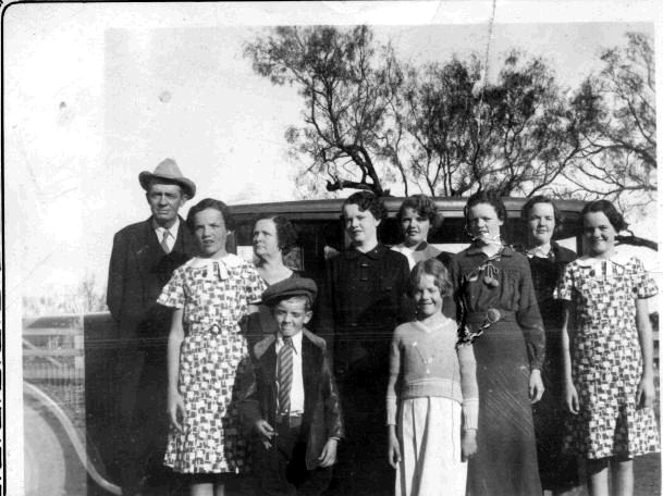 ![]() Elbert Dean Sr., Lillie Mae, and children: front row-Elbert Jr. and Rena, back row-Bernie, Paulene, Mildred, Maureen, Margaret, and Boots With the tree in the horse lot for scenery, the family posed at the barn gate to the stack lot. Uncle Floyd and Aunt Marie brought out this 1929 Nash with a big, wooden steering wheel. |