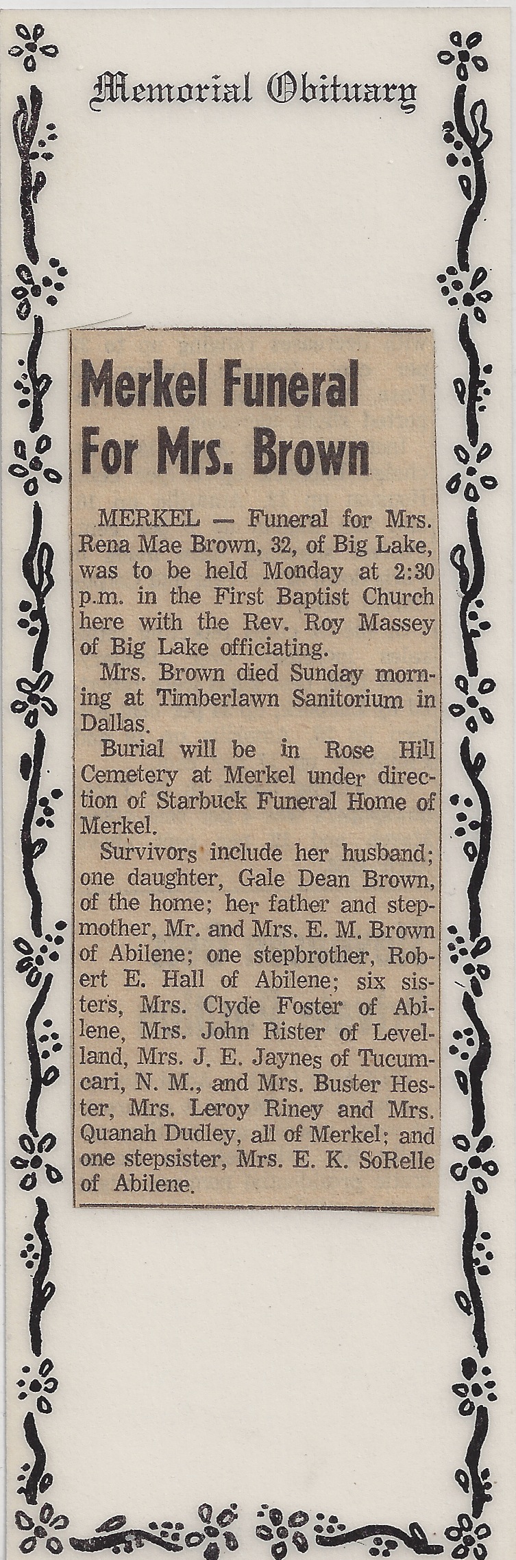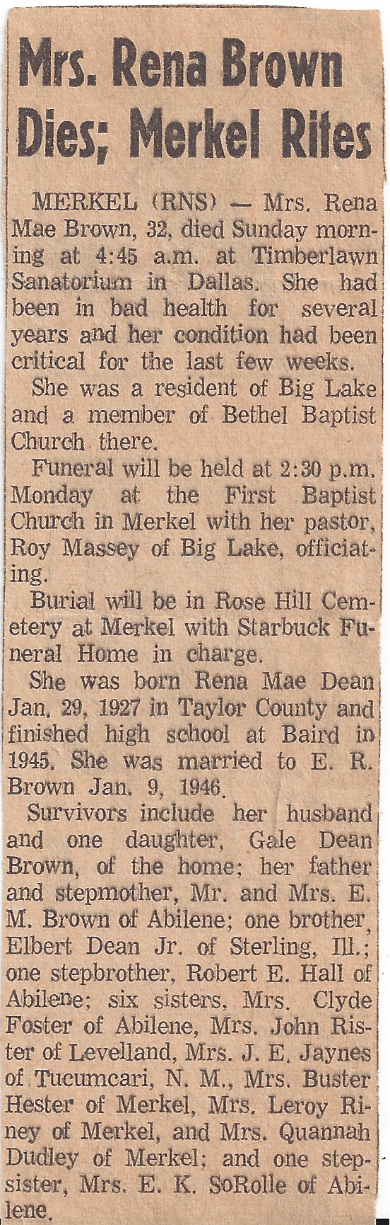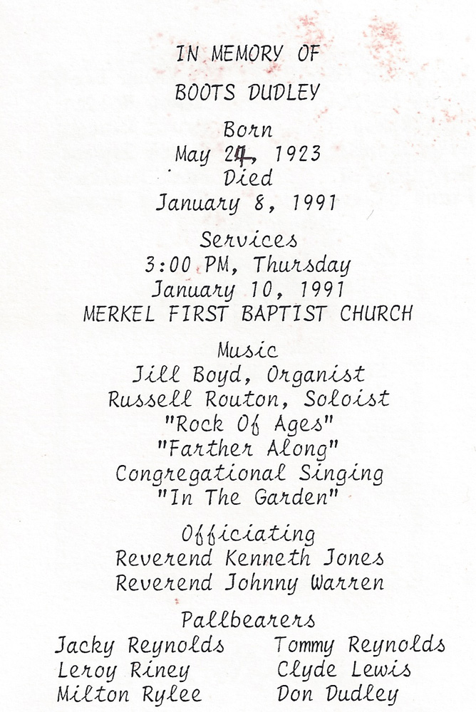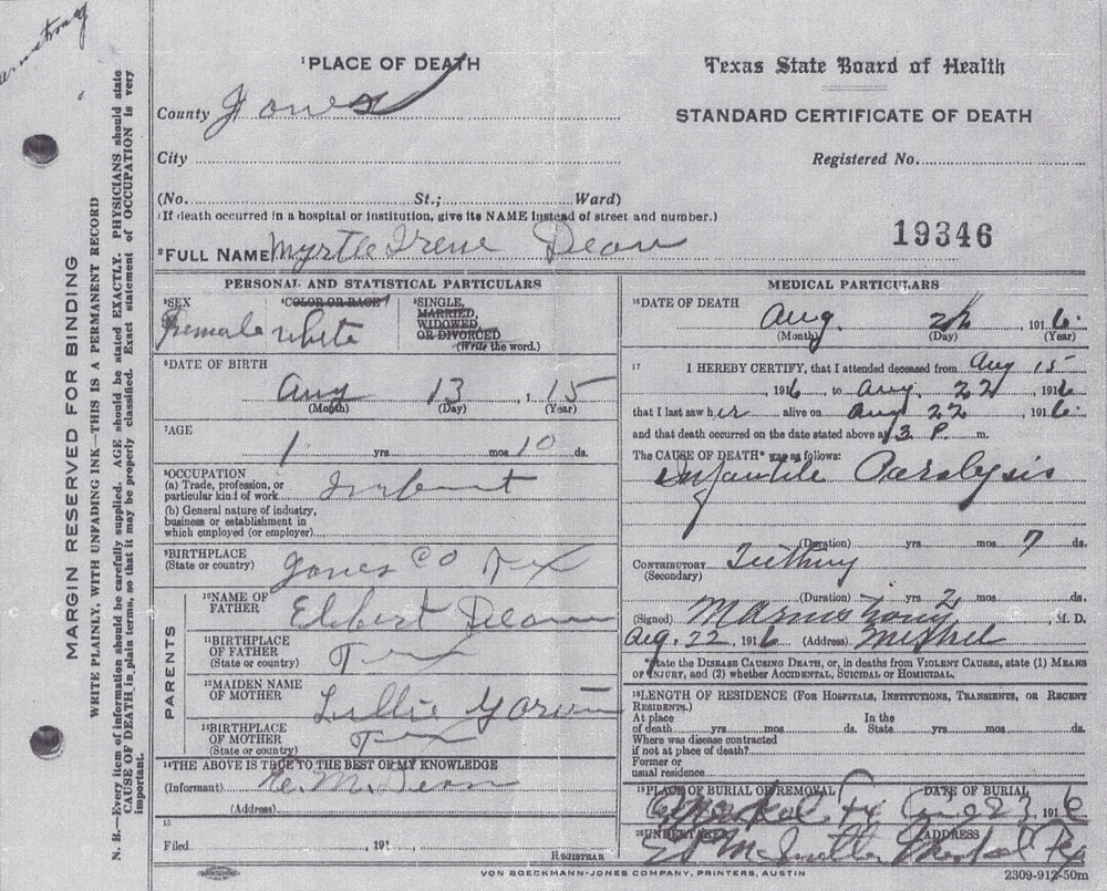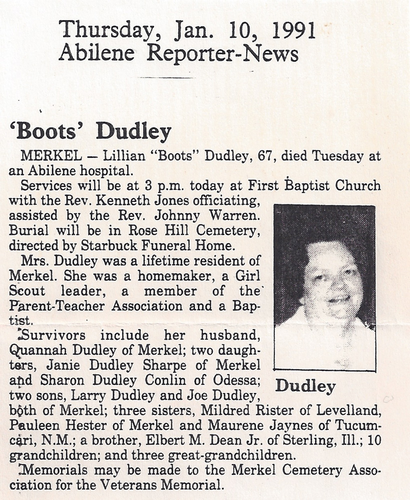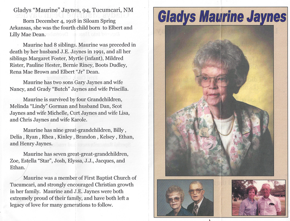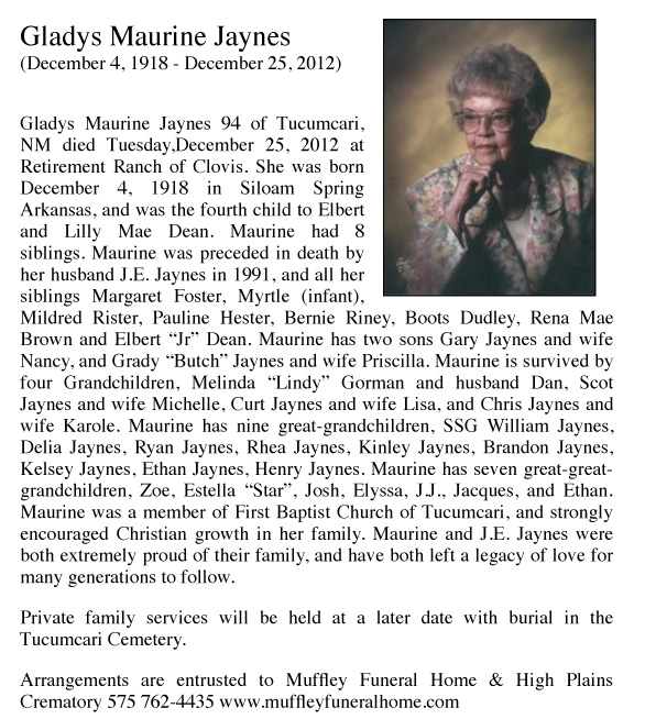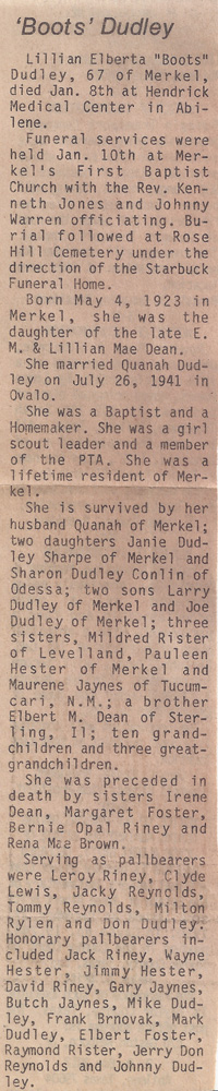 Father's Parents: Richard Hulan Dean & Lizzie Ellen Reeves Dean Mother's Parents: Charles Angus Garvin & Laura Etta Witherspoon Garvin Father & Mother: Father: Elbert M. Dean, Sr. (1890-1965) Mother: Lillie Mae Garvin Dean (1891-1944) Children: #1: Lena Margaret Dean Foster (1914-1974) Family, Daughter, Obit, Obit 2 #2: Myrtle Irene Dean (1915-1916) Death Certificate #3: Mildred Faye Dean Rister (1917-2003) Obit, Funeral #4: Gladys Maureen Dean Jaynes (1918-2012) Obit, Cover, Funeral #5: Eula Pauline Dean Hester (1920-2001) Memory #6: Bernie Opal Dean Riney (1921-1961) Wedding, Boys #7: Lillian Elberta "Boots" Dean Dudley (1923-1991) Obit, Obit 2, Funeral #8: Rena Mae Dean Brown (1927-1959) Obit, Obit 2 #9: Elbert Marshall Jr. (1929-2011) |
