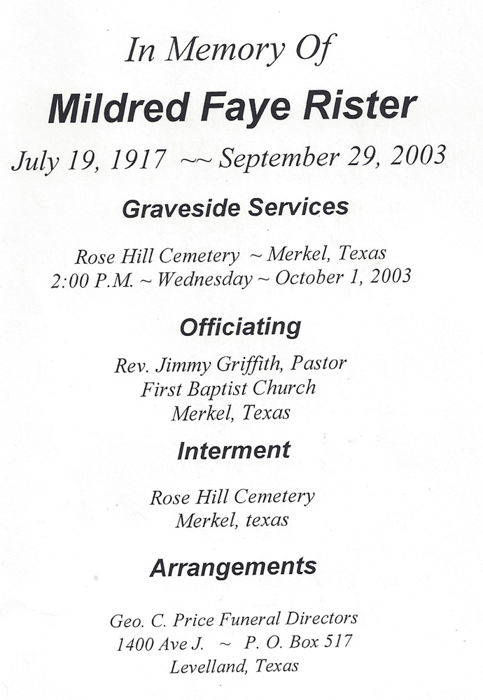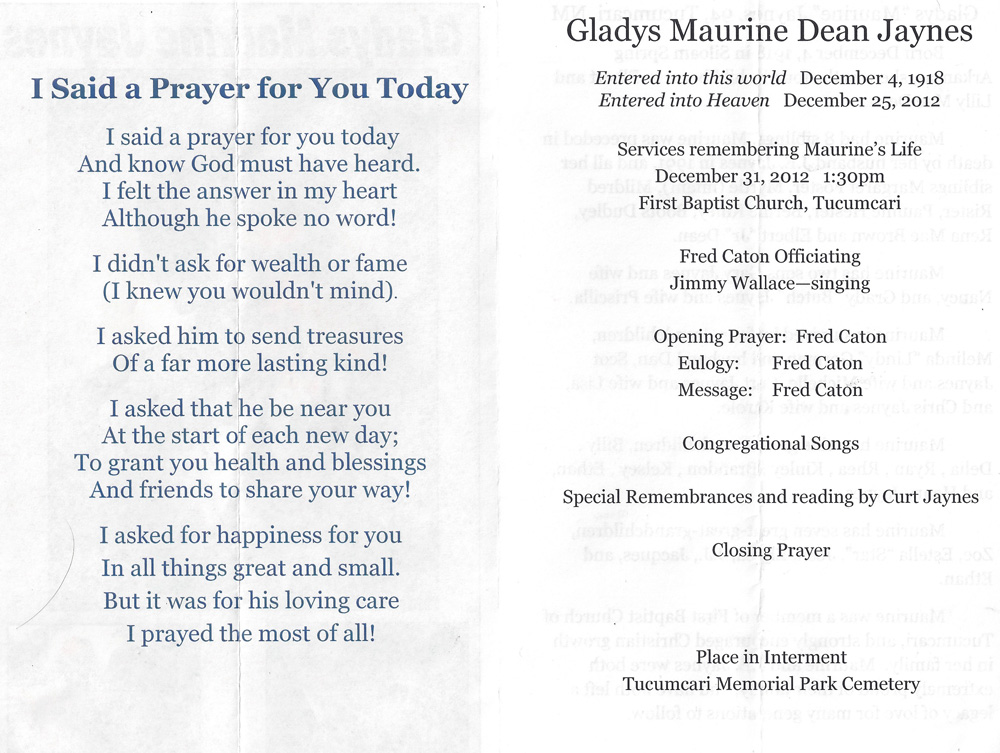 "I cannot ever remember not being in church. My earliest recollection was going in a horse-drawn buggy. We attended a small country church with wooden slatted benches and gasoline lanterns for lights. My dad was song leader and we kids were watched and poked if we dozed. Our friends were all church families. We loved and cared for one another going anywhere sickness was, and the adults would sit up all night if needed. We memorized Scripture, and a happy time was when we had a paper with a picture of Bible characters. We were elated when and if we had a penny for collection time, but I don't recall regular Bible reading time in the home and prayer time was not stressed to us at a very young age. When any one in the community was in trouble, the men would meet at different homes and have prayer meeting over that one." (recalled of her childhood by Maureen) As she was the oldest and last living member of the Elbert Dean, Sr. family, I asked her to write down all her memories of her family. I have excerpted these memories throughout this family site. Click on this link for Aunt Maureen's 5 page memoir. To my knowledge, she is the only member of this family that wrote out any genenral memories of the Elbert Dean, Sr. family. |
