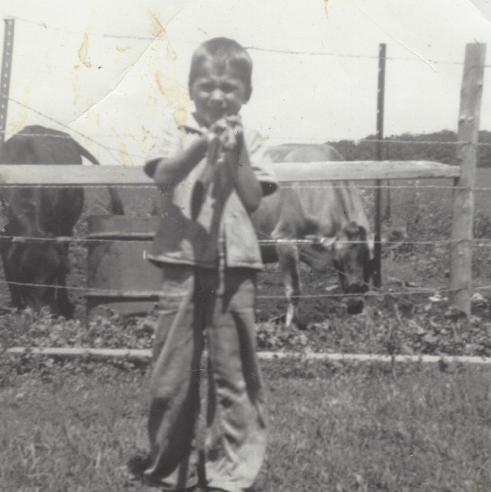 ![]() Billy with Gun Tricks by Jerry & John The picture is of brother Bill, taken by me (Jerry) with his second hand "box camera" on the North Walworth farm. Anxious to use up the 12 picture film, we would create situations which, at the time we thought cute and clever. Somebody (?) had the bright idea of aiming the B-B gun with the barrel resting on the shoulder and the butt-end toward the guy behind the camera. It looks like the Jersey cow was safe if Bill had pushed the twigger. We were not given instructions on gun safety nor was common sense part of our childhood years. The Jersey cow was our butter for mom's homemade bread. There was always plenty of cream available for us to churn and whatever else cream was good on. The black bull got lose one day and ended up in the front yard of a neighbor about 1/2 mile away. The irate neighbor called our home and complained that the bull would not allow him out of the house. Dad went right over. When he arrived, the bull faced dad with his head down, making it plain that he liked right were he was. Dad kicked him in the nose and drove him home. |