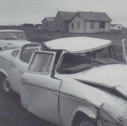 That car wreck was on the way home from our 1965 senior trip to the black hills. Our small graduating class fit into three vehicles. Grandfather allowed me to drive his Studebaker. On the way home and late at night, some fifty miles from Sturgis, S.D. we were in hilly countryside. At the bottom of one long hill there was a bridge over a dry gulch. I must have had my lights on dim. When I leveled out, at the entrance was a cow (or deer,) I hit the brakes too hard, the car careened off the embankment, and after being airborne we hit nose first, and the car flipped over on its top. When the other two vehicles finally stopped for a rare stop sign, we were missing. They backtracked and somehow found us at the bottom of the dry gulch. The front doors were open, I was half out on one side, Rick Fields was half out the other side, the three in the back were all in the front and on top of the girl between Rick and me. Rick and one of the gals in the back seat walked away with few injuries. I think that only two of us ended up in the hospital for several days. When I was able to come back to Huron, Grandpa Tschetter said to me, "That Studebaker was going to be your graduation gift!" Three weeks later we were all at graduation with crutches, wheelchairs, black eyes, bruises and stiches and very grateful to be alive. (recollections by Jerry) |
