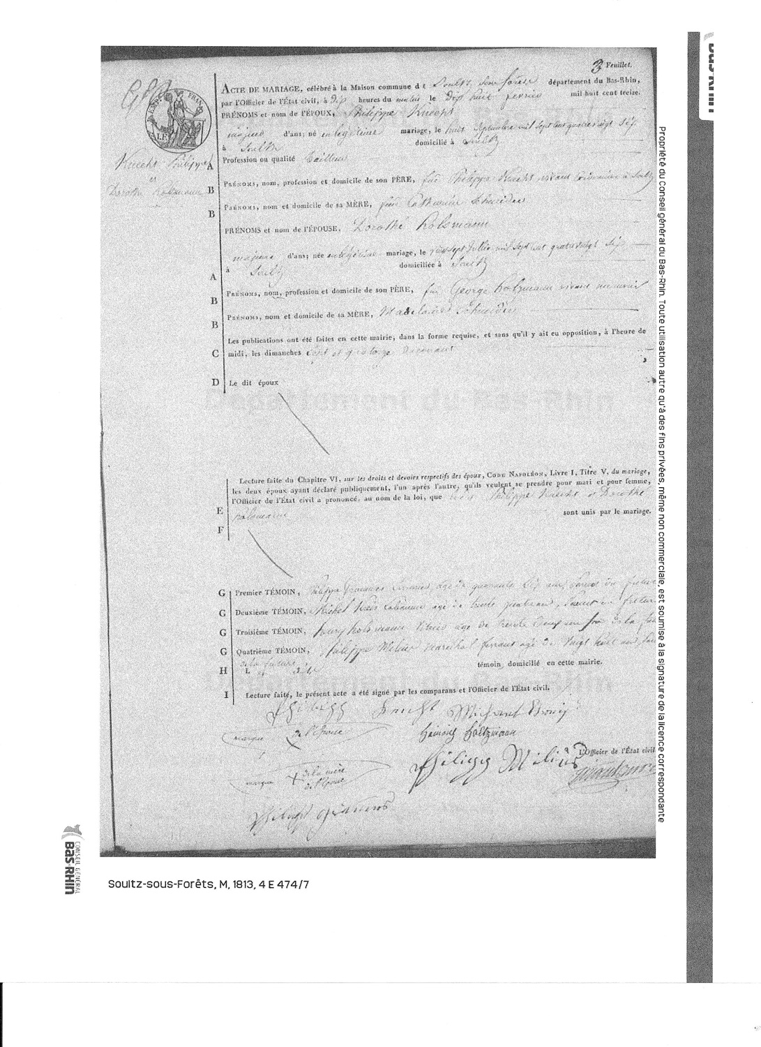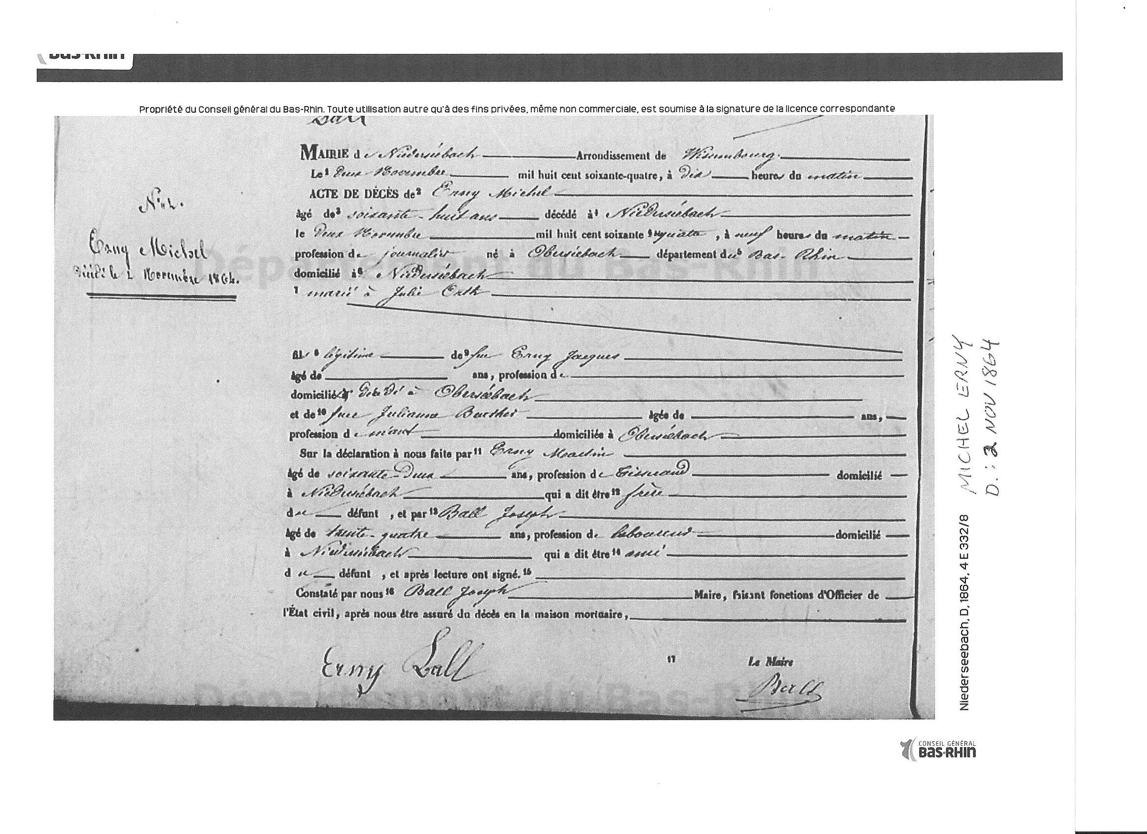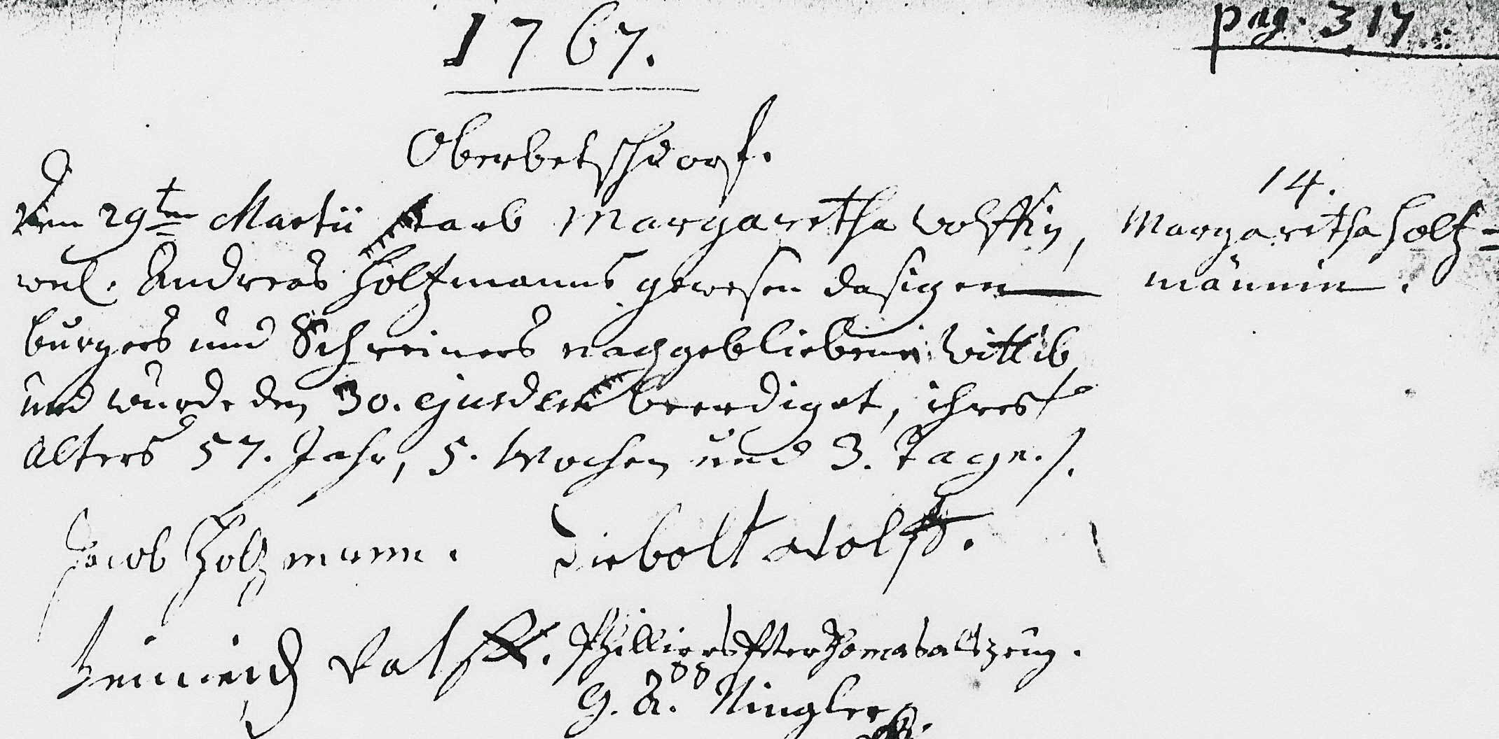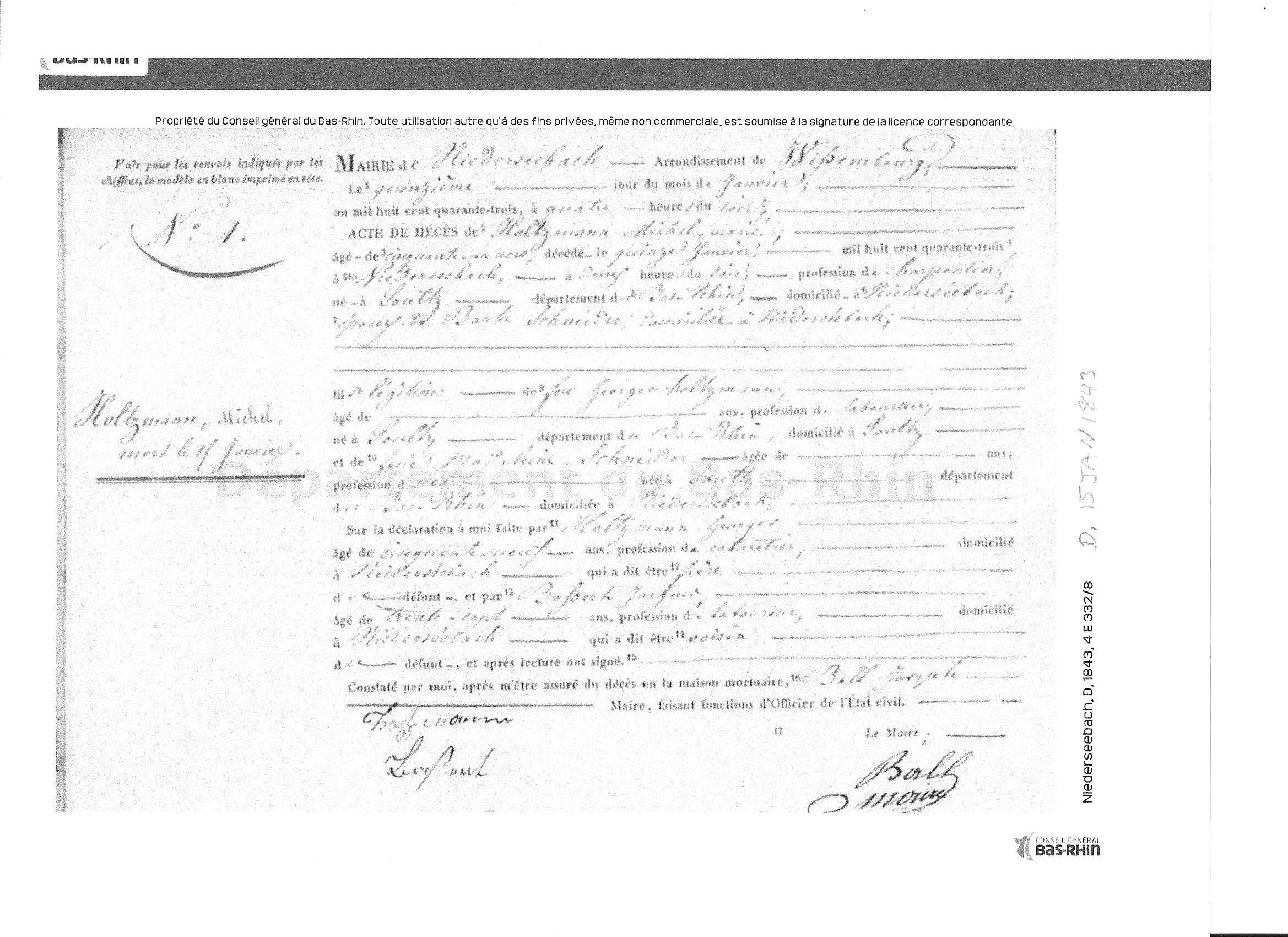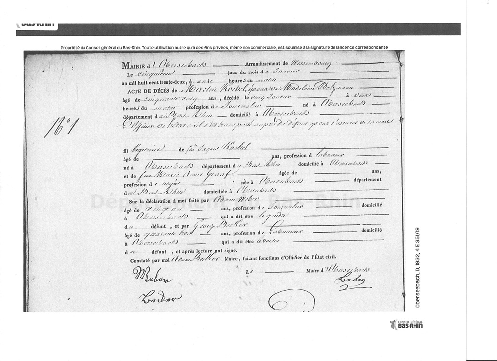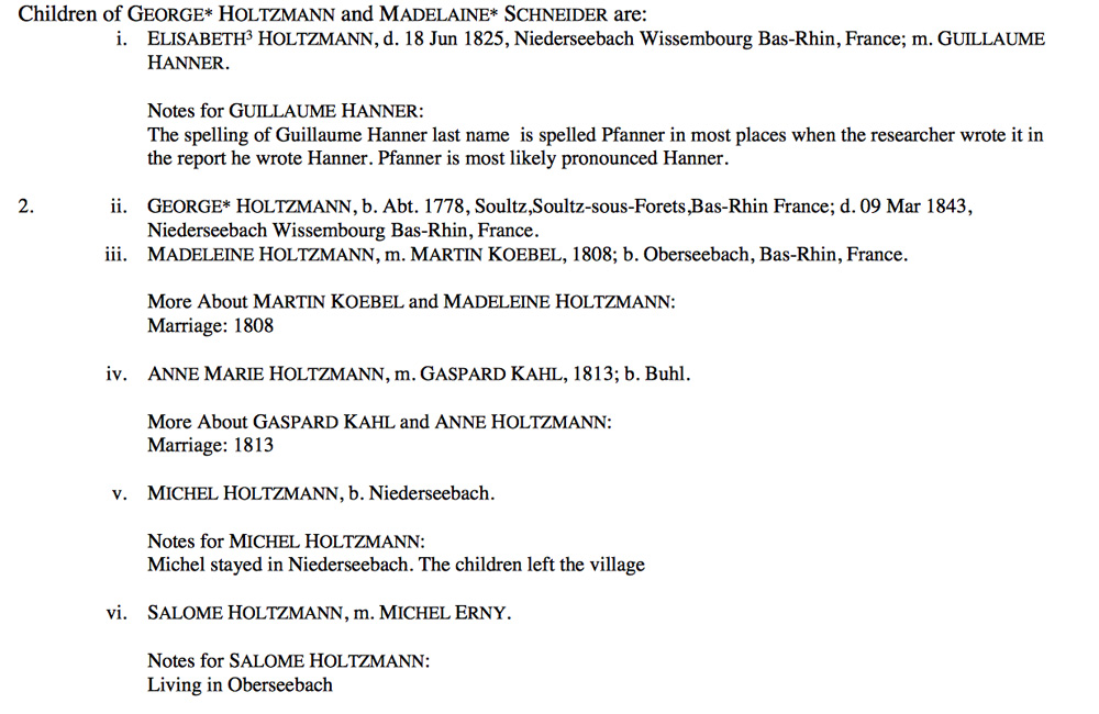 GEORGE JUNIOR'S PARENTS: George's (junior, son) death record stated that George (senior, father) and his wife Madeleine Schneider died in Niederseebach. (Researched by Anthony T. Earl. LDS.) The marriage record indicates that Andreas Holtzmann and Margaretha Wolff were married on April 24, 1731, Oberbetschdorf, Bas-Rhin, Alsace, France. The baptismal record indicates that a George Heinrich Holtzmann was born to Andreas Holtzmann & Mararetha Wolffe and baptized on June 29, 1752. The death record indicates that Andreas Holtzmann died on March 7, 1753 at Oberbetschdorf, Ba-Rhin, Alsace, France, age 44 years, 6 months. Margaretha's death record indicates she died on March 29, 1767, Oberbetschdorf, Bas-Rhin, Alsace, France, age 57 years and 5 months. 29 JUN 1752 in Oberbetschdorf Many thanks to David Heintz, 4 Great Grandson of George Holtzman Sr., for researching and finding most of these various birth, marriage, census, and death records from early France. Full Holtzman Genealogy Report |