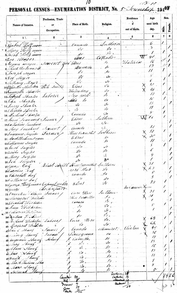1851 Census: Page 1 Last 3 Entries: Henry, Christina, George Parent's Birthplace: Elsas. Religion: Lutheran. Parent's Ages: Henry (33), Christina (24) George's Age (8) ![]() |