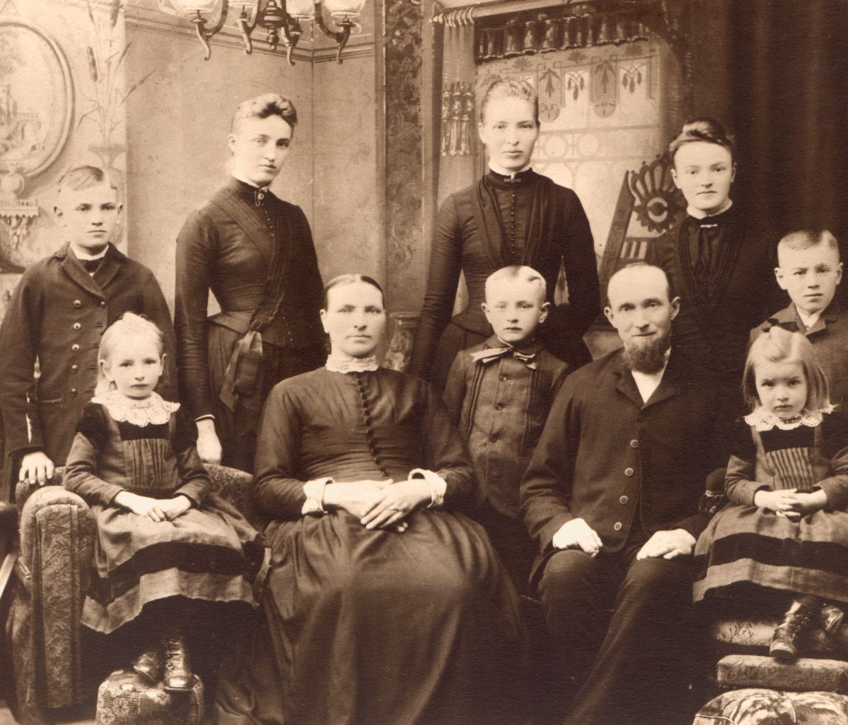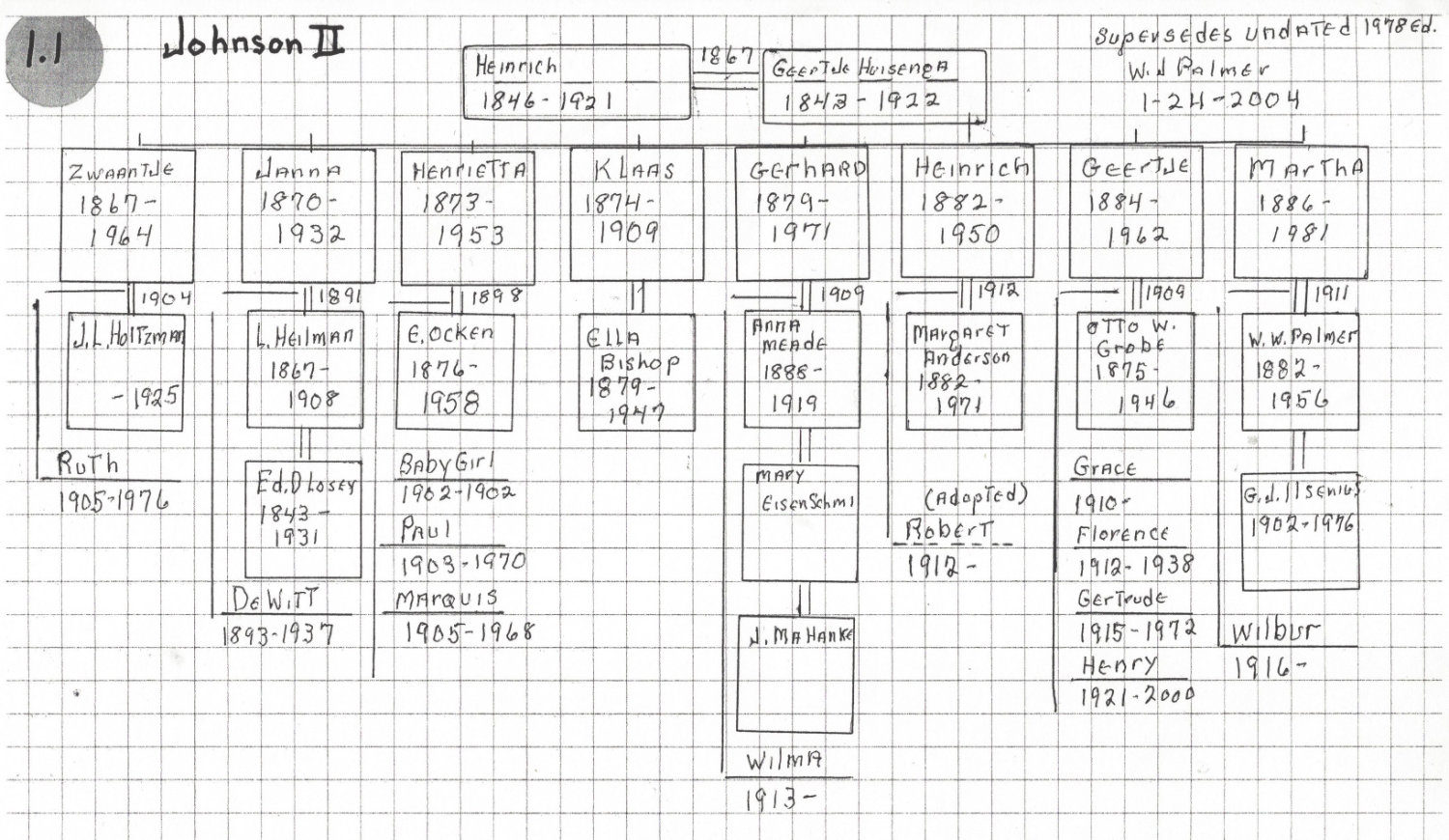 ![]() Henry Johnson Family: Front Row: Gertie, Mother, Henry, Father, Martha. Back Row: Cotta, Jenny, Zwaantje (Grandma Holtzman), Henrietta, George. Grandson Bill Palmer (son of Martha) compiled this sketch of the 8 Johnson children, their spouses, and children. |