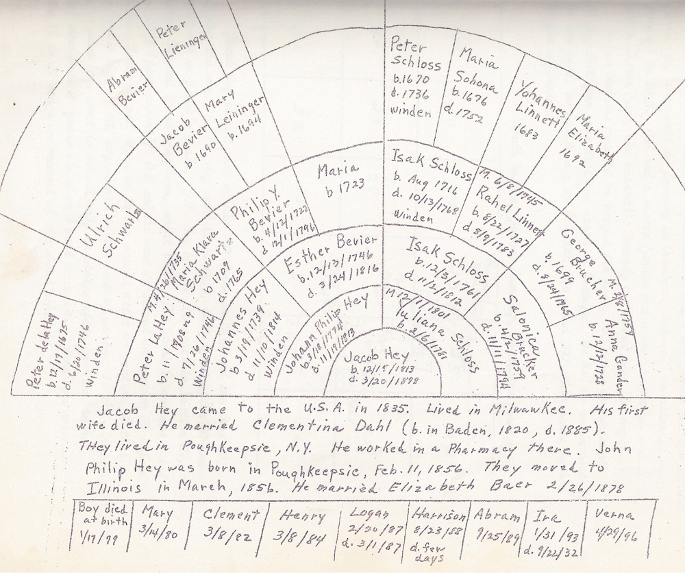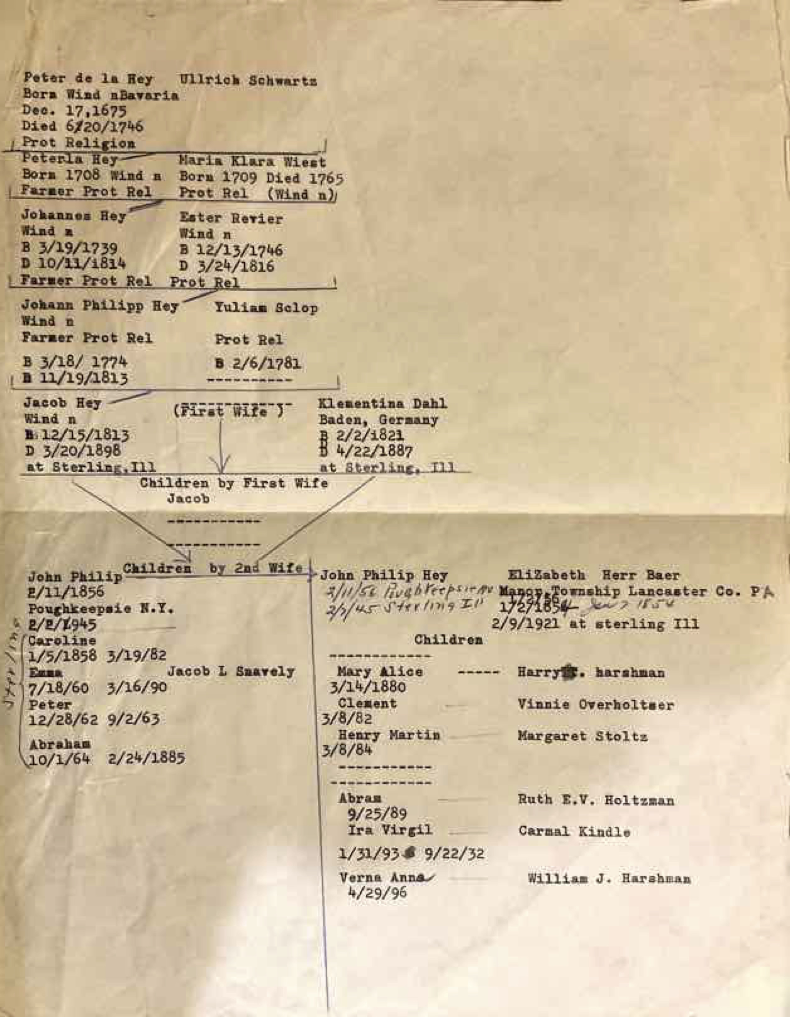 ![]() Photo from Winden A brief letter regarding research and travels regarding Hey ancestry, by Delores Irene Hey Toner. Longer letter regarding research and travels regarding meeting German Hey relatives, by Delores Irene Hey Toner. (Delores and her forbears are buried in Forest Hill Cemetery, Shelbyville, Indiana.) Pages 1-2: her own Hey ancestry Pages 3-4: contact with Uncle Henry & Aunt Mary Pages 5-9: meeting German Hey's Page 8: our (Jacob Hey) ancestry Pages 10-13: further correspondence Lengthy 1948 letter from a Wilhelm Beutel of Winden, Germany to Aunt Mary Harshman containing much data on Hey relatives in Germany. The writer also references Great Grandfather Jacob Hey, grandfather of Mary Harshman. Typewritten genealogy found by Chuck Cherry in Abram Hey house on First Avenue, Sterling: Hey Genealogy. Generally, same data as chart upper right. |
