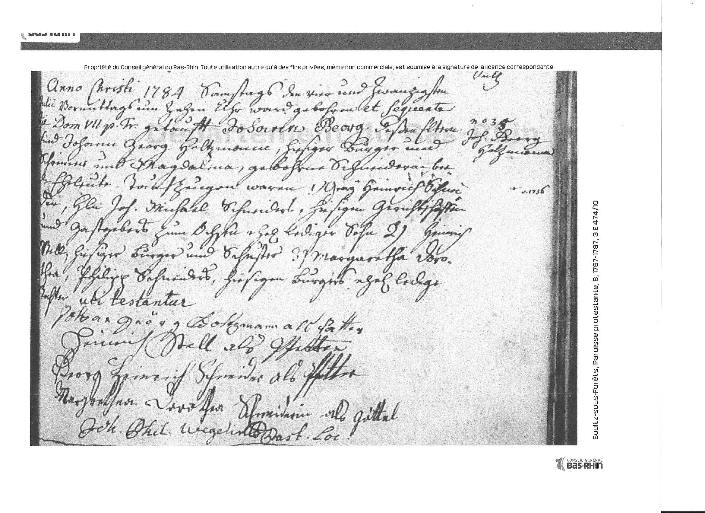 Baptism of George Holtzmann Prior to the French Revolution (1789 to 1799) records of birth were recorded and kept in the commune churches. The revolution brought about radical changes. Births, as well as marriages and deaths were now considered civil acts and no longer recorded in the church. The church was separated from the "state". George Holzmann's baptism in 1784 can be found in the protestant church records of 1767-1787. His year of birth therefore is most likely 1784. (from David Heintz) George Holtzman Family George Holtzman Baptism Mayor George Holtzman Madelaine Holtzman Grave Dean-Hey Heritage Homepage |