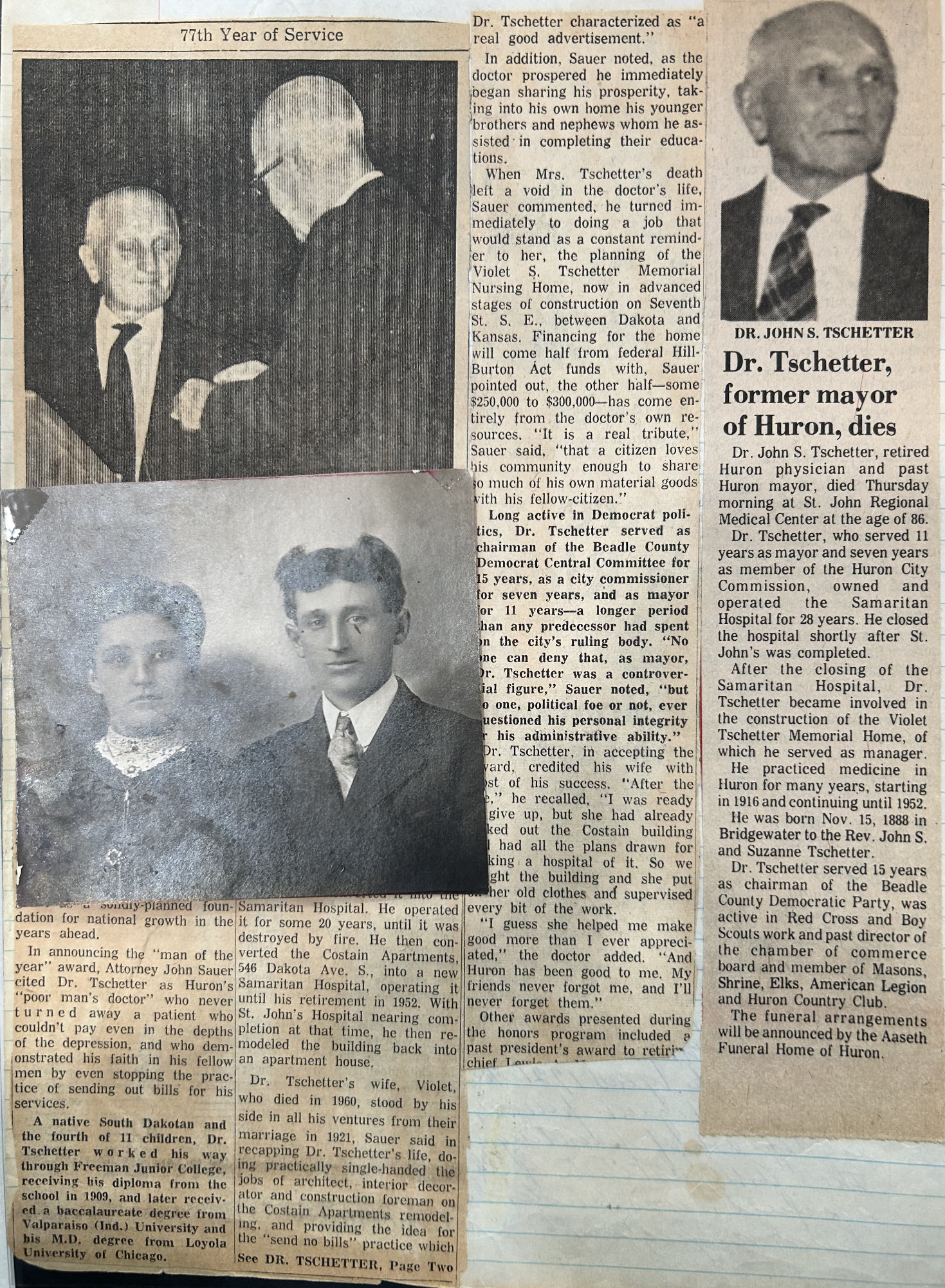 Several of John and Susanna's children rose to prominence. Three became doctors: John, Paul, Joe. John established a hospital at 720 Dakota, Huron. Eventually, it became the Samaritan Hospital. Paul, along with nephews Theodore Hohm and Paul Hohm (sons of Susanna, daughter of John and Susanna), built the Tschetter-Hohm Clinic at 455 Kansas, Huron in 1949. Joe became a doctor in Whitehall, Wisconsin. In 1962, John built the Violet Tschetter Memorial Home in memory of his wife. (The home closed May 10, 2019 due to lack of funding.) John became mayor of Huron (from Huron Revisited) for a total of 11 years. Violet, John's wife, christened the battle ship South Dakota. Because the Violet Tschetter Memorial Home cared for Senator Hubert Humphrey's mother, the senator wrote John a personal thank you. Violet, John's wife, was a painter. Several of her works adorn the walls of the Violet Tschetter Memorial Home. The bottom 6 photos on this page are taken from those same walls. ![]() Violet Tschetter Memorial Home, opened by Dr. John in memory of his wife |