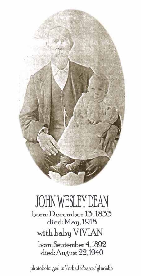 John Wesley Dean Our great, great grandfather: Texas State Archives: Texas Civil War Veteran (Enter "Dean, John Wesley"; John's second wife, "Ida M," then drew a widow's pension.) Civil War Veteran: At rest as a recognized Texas Civil War Veteran in Woodside Cemetery, Grand Saline, VanZandt County, Texas, Section 6A. John Wesley Dean (1833-1918) history, by Milton Forsythe In early 1885 John Wesley Dean and his family loaded all their worldly possessions into two old Schoonover type covered wagons and headed south to Brown County, Texas. John Wesley and his family settled near the Brownwood Township and farmed the land as a sharecropper. As a young girl Richard's mother Lucinda Dean contracted the deadly Rheumatic Fever, and during their trip to Brown County experienced several renewed episodes of this deadly virus. After each episode Richard's father immediately stopped the old Dean Family Wagons and allowed Lucinda to rest for the duration of the day. After arriving in Brown County Lucinda also experienced chest pains. The pains suddenly increased and she suffered a massive heart attack. John Wesley immediately summoned a physician and after a thorough examination the physician acknowledged Lucinda's heart has received severe damage. The physician also stated because of the severity of Lucinda's heart attack he feared she would not survive. During discussions with John concerning Lucinda's fate, the physician also recommended Lucinda receive 24 hour attention. During the ensuing days Lucinda's condition remained unchanged. However within weeks her condition gradually improved and thereafter she resumed housekeeping duties. Lucinda often suffered dizzy spells and occasionally lapsed into a semi-conscious state. On April 22, 1885 Lucinda suffered renewed chest pains and shortly thereafter lapsed into a deep coma. During this traumatic era of their lives Richard and his siblings cared for their mother's daily needs and remained at her bedside as she lingered near death. During the night of April 22, 1885 Lucinda apparently suffered a massive coronary because early the next morning Richard and his siblings discovered her dead in bed. After his mother's untimely death Richard and his family remained in Brown County, Texas and young Richard assisted his father with the chores on the old Dean family farm. John Wesley Dean soon came to realize that life without Lucinda was causing tremendous burdens on himself and his children. According to family relatives John realized the coming summer crops on the Dean family farm would require his daily attention. Thus he was forced to choose between harvesting the crops and caring for his children. |