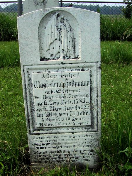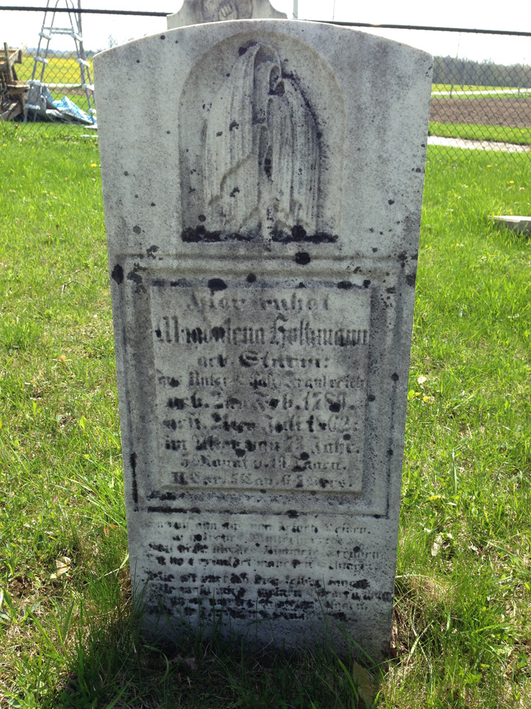 Inscription: Hier ruhet/ Magdalena Holtzmann/ geb. Sturm/ aus Unter Elsass Frankreich/ geb. 2ten Feb 1789/ gest 21ten Juli 1862/ im Alter von 73 Jahr/ 5 Monat u. 19 Tagen/ II Cor 5 Cap 6-7 Vers. Translation: At Rest. Magdalena Holtzman. Born Sturm. In Lower Elsass, France. Born 2 Feb 1789. Died 21 Jul 1862. At the Age of 73 Years, 5 Months, 19 Days. II Cor. 5:6-7. ![]() Berlett Corners Cemetery Madelaine Holtzman's Stone is photo center, second row from back, left side appearing to touch (in the photo) the swimming pool stairs. |