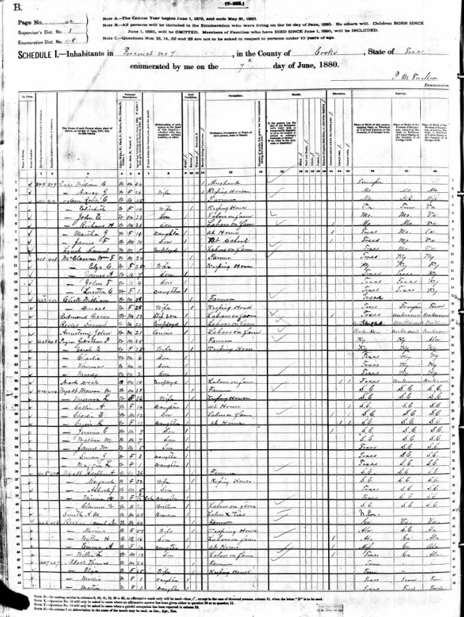 Following typical westward migrations, Samuel & Melvina moved from Alabama in 1850, to Mississippi by 1870, and to Texas by 1880.