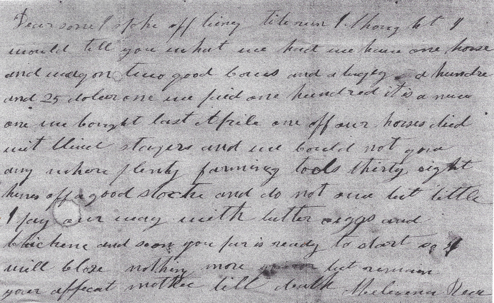 ![]() Melvina Reeves' Short Letter (to son Rufus appears to be in response to his concern that his parents weren't getting along well financially) Translation: Dear sone I spoke off being tite own Money but I would tell you what we had We have one horse and wagon two good cows and a bugey a hundred and 25 dolar one we paid one hundred It is a new one we bought last Aprile One off our horses died with blind stagers and we could not gow any where plenty farming tools thirty eight hives off a good stock and do not owe but little I pay our way with butter eggs and chickens and so on Your par is ready to start so I will close Nothing more but remain your affecat mother till death Melvina Reeves Samuel Reeves Family Samuel & Melvina's Letters Samuel & Melvina's Census Dean-Hey Heritage homepage |