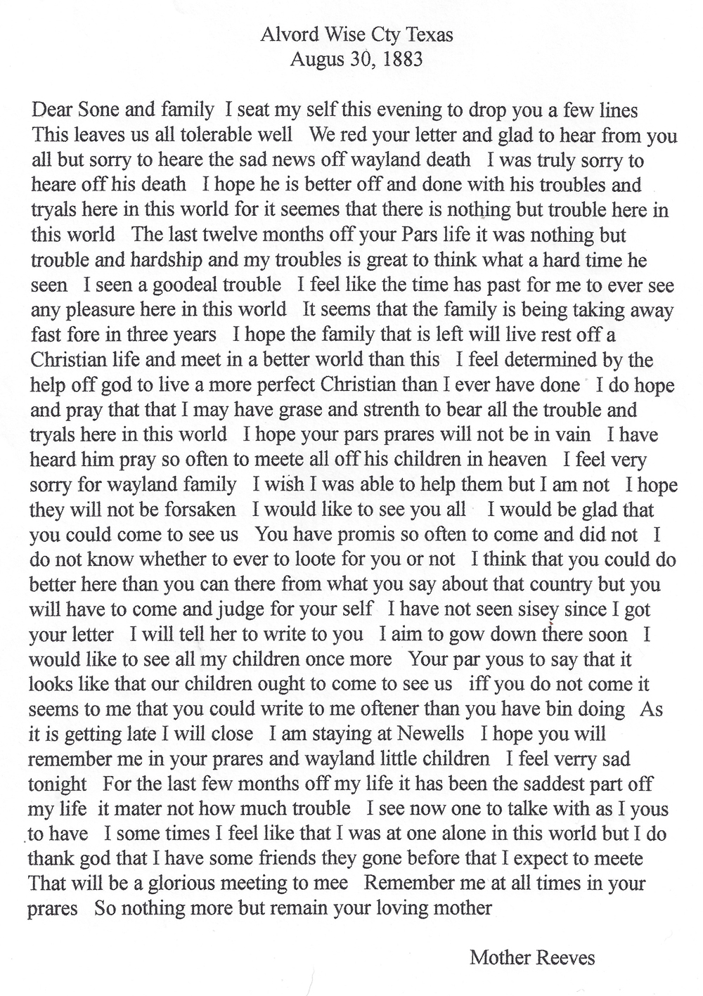 These three letters sent to me by John Reeves, great grandson of John Rufus Reeves, and great, great grandson of Samuel and Melvina Reeves. Melvina's short letter to son Rufus, date and place unknown, evidently 1st of the three letters. Samuel Newell Reeves' two page letter to his son Rufus in 1891. Melvina Hodges Reeves' three page letter to son John Rufus Reeves (John Reeves great grandfather). Melvina's husband had recently died, and she was staying in Alvord, Wise County with another of her sons, Newell A. Reeves. (Explanation by John A. Reeves regarding the year of Samuel's letter, 1891, the year of Melvina's letter, 1883, and the fact that she refers to Samuel as having recently died.) "You will realize right away that there is something wrong with the dates. This letter appears to have the date of May 24, 1891, but Melvina's letter was dated 1883, and in it she said that her husband had passed away. Samuel mentions in his letter that he is writing on the Sabbath. I checked, and May 24, 1891 was a Sunday so the 1891 date is correct. I think Melvina was old enough that she was losing track of the years, and just accidentally wrote 1883 when the year was 1893." |