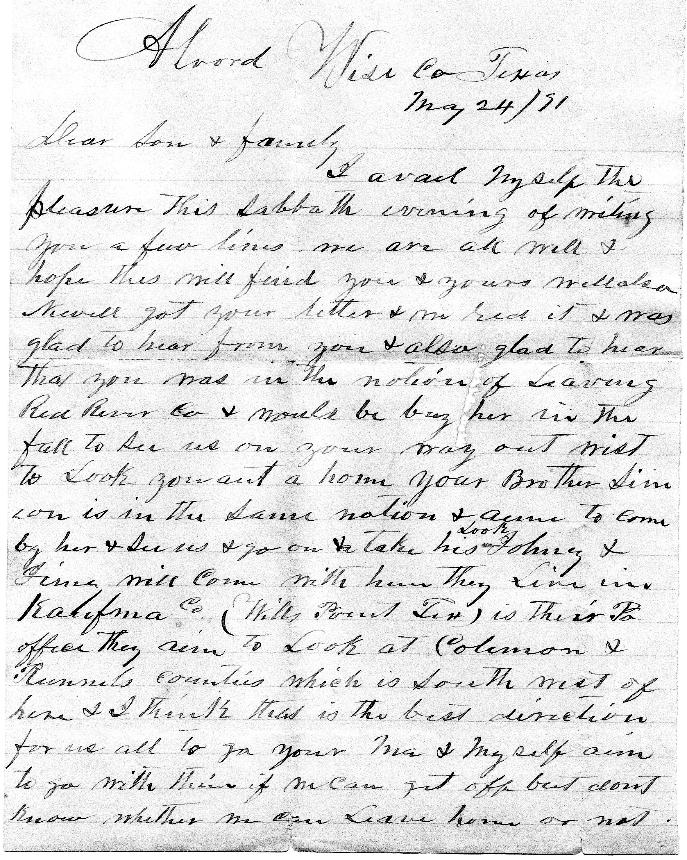 Melvina Reeves' Letter, Page 1 from Alvord, Texas, to son John Rufus (Click for all three pages of Melvina's letter.) (Translation) |