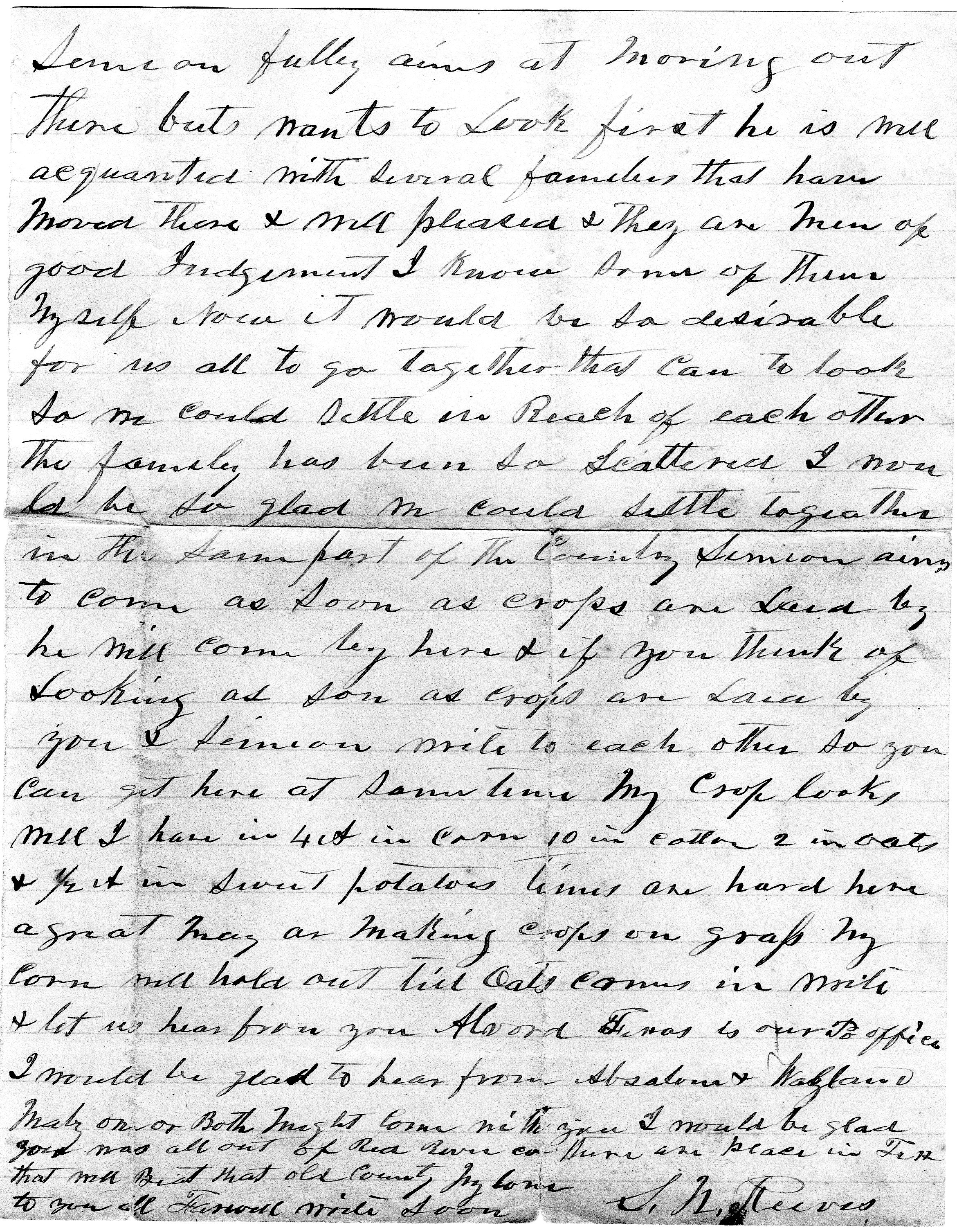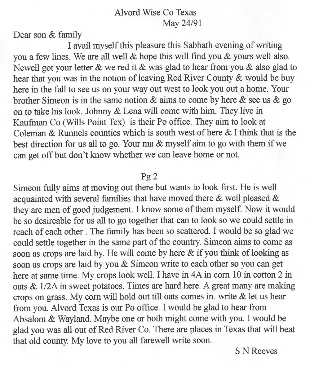 Samuel Reeves' Letter, 1891 (Translation) ![]() Samuel Reeves' Letter, Page 1 from Alvord, Texas to son Rufus in Red River County ![]() Samuel Reeves' Letter, Page 2 from Alvord, Texas to son Rufus in Red River County |