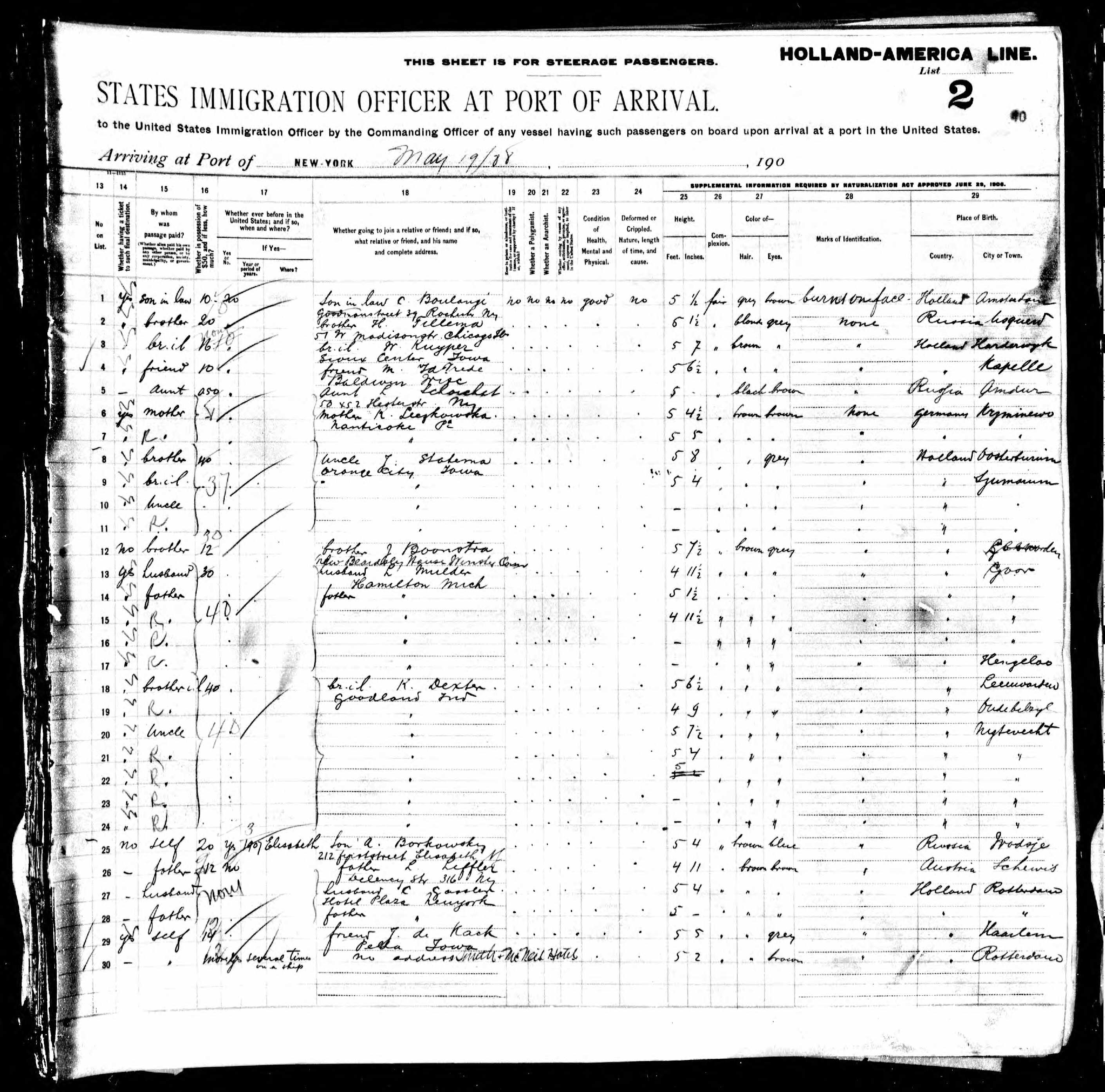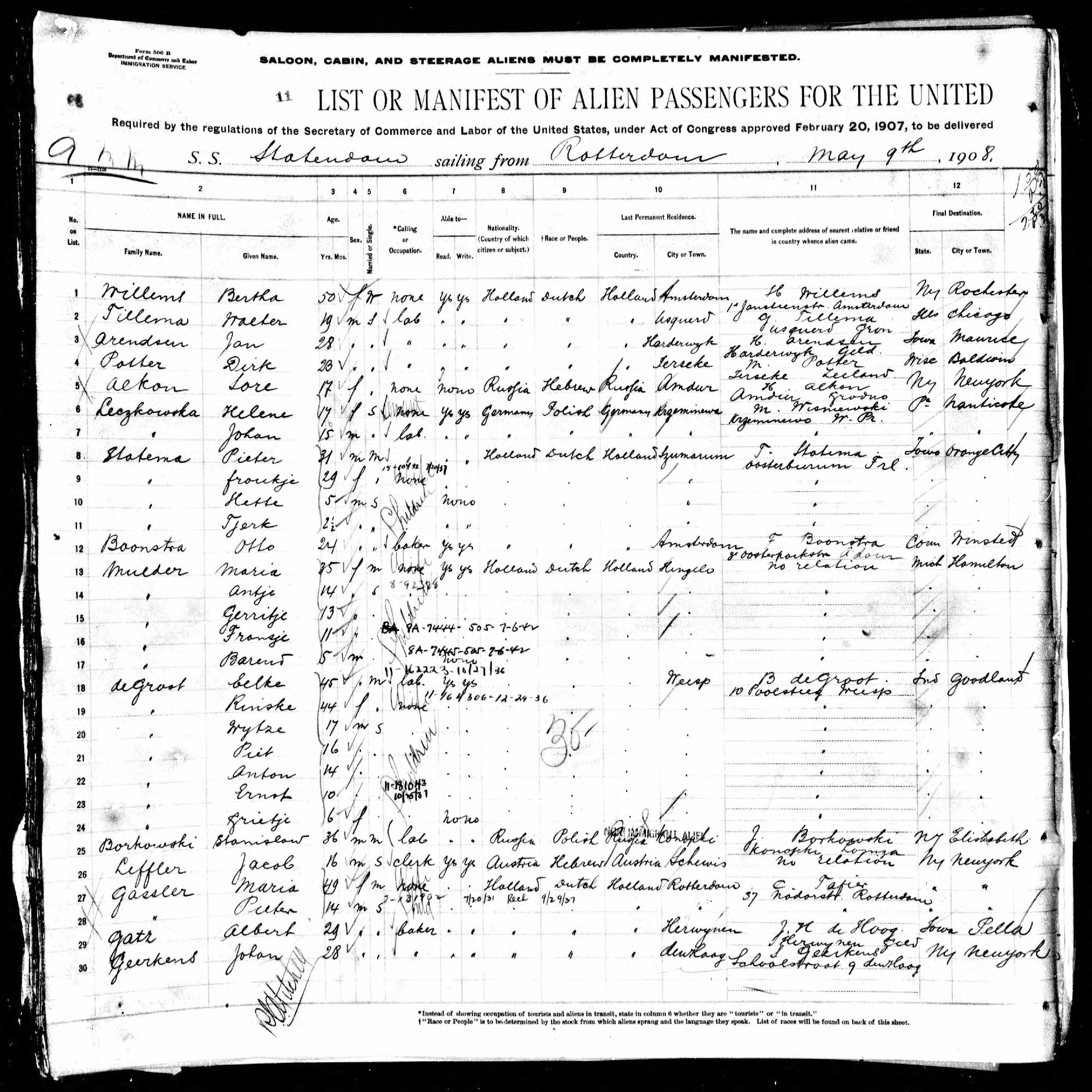 Peter (Pieter) and Florence (Froukje) along with their sons, Harry (Hette) and Charlie (Tjerk), sailed from Rotterdam, May 9, 1908 and arrived in New York on May 19, 1908 aboard the Statendam. Fannie (Feikje) was left behind with her maternal grandparents and arrived on May 19, 1910.