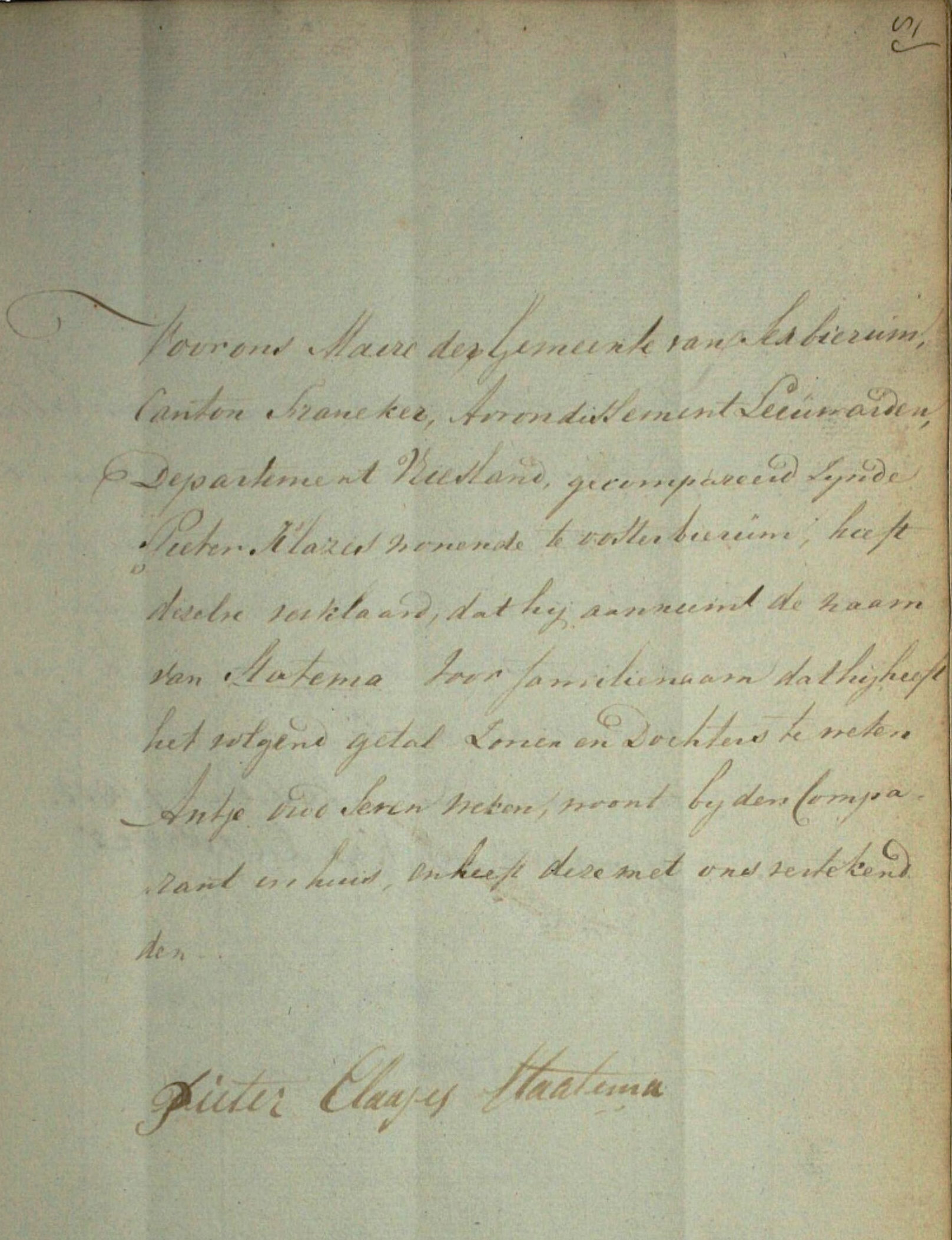 Document Taking Surname Statema, 1811 Signed by Pieter Klazes (1778-1855) Grandfather of Tjerk Klases Statema ![]() A copy of the official document of the taking of the surname "Statema" by Pieter Klazes (1778-1855) for his family. This Pieter is the direct ancestor of Susan, Kathy and myself (our 4th-great-grandfather). This was done in 1811. An explanation: Most people in the Netherlands before 1811 did not have a surname. Your first name and your father's first name (called patronymic) was the way people were named. For example, my first name is John, my father was Pieter, so I would be called John Pieters, meaning John, son of Pieter. In 1795 Napoleon conquered the Netherlands. He wanted to tax Dutch people to fund his wars but found very difficult to track anyone because all records were kept in churches. There was no "county clerk" system and their were no surnames. There were thousands of "Pieter Klazes". So, Napoleon set up a municipal system to register each adult male and their families. They were still allowed to register birth, deaths and marriages in the local church but were mandated to register them at the county seat. So, men had to take a surname. Pieter Klazes took the surname of "Statema" in December of 1811. (Photo, document, explanation, and research all provided by John Nauta, our 3rd cousin. Thanks.) |