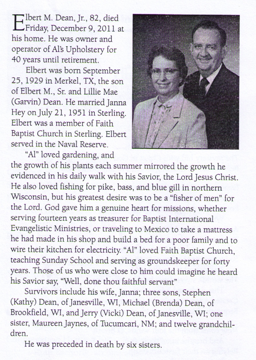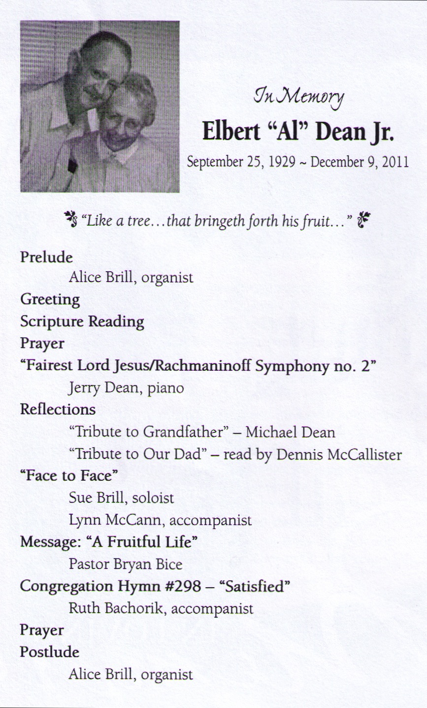 ![]() Home Elbert M. Dean Obituary Elbert M. Dean Service Jerry's Tribute Steve's Eulogy Michael's Eulogy |