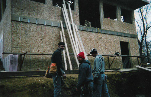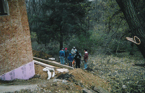 My Florida nephew Jon solved this problem. Jon was a framer. I offered to buy him a ticket and top his wages to come help frame. Ben, another friend, of Hughes Custom Carpentry, was our builder. And so it happened that on Saturday morning, October 12, 2002, two crews (each with a professional and several handy volunteers) began to frame Mocha Moment. Our son, Jared (striped cap), was a senior and helped us as much as he could. |