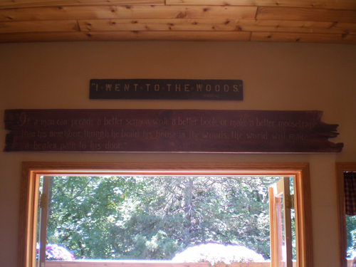 We needed public hearings for two matters: rezoning and deck seating. Only one person opposed the petitions, commenting that we would ruin the historic significance of the corner. The public will have to decide to what extent we've ruined the corner. The City of Janesville became our significant opposition. I said, "We want to build on the South side." The planner said, "You can't. You'll go broke. Build on the North side." I said, "I want to build back by the woods so people can enjoy the woods." He said, "You've got to build by the street so people can see it." I said, "I want Mocha Moment to face the woods so people can enjoy the woods." He said, "You have to face the street so people can see it." At this impasse, my longtime friend, Sheila, who created and maintains our website, sent me an Emerson quote: "If a man can preach a better sermon, write a better book, or make a better mousetrap than his neighbor, though he build his house in the woods, the world will make a beaten path to his door." The quote now hangs over our deck doors, etched by our cousin, Dawn, on barn board donated by our friend, Dennis. |