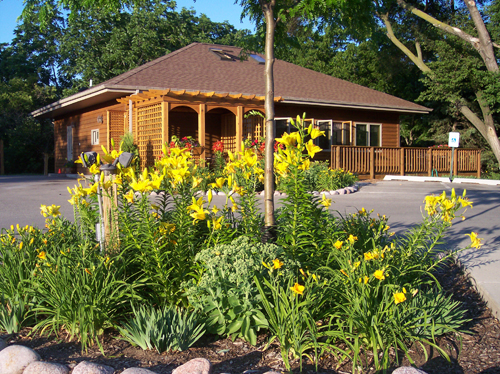 And one more area needs highlighting: the gardens. When we acquired the corner, Scott, whom I barely knew, asked me who would landscape it. I said, "My friends and I." Scott offered to help, but I said, "I know who you are, and I can't afford you." Scott replied, "I like this place, and I want it to succeed. Can I help?" And "help" he did. Only minutes before Rory was to construct a plain deck at Timberland, I "coincidentally" introduced Scott to him. After a brief discussion, Scott said to me, "We've redesigned your deck. Your place is too beautiful. You should have a rounded deck. I'm building it." And that's why we have a round deck. (And after years of indecision on what to do with the space immediately outside the front door, Scott said to me one day, "I know what belongs there!" And that's how we got the pergola.) Jeannie grows wildflowers! And how! Jeannie has planted the gardens surrounding the Timberland building. And she and husband Chris faithfully nurture and water it all. When the corner was still bare, Scott said, "People will want to get married here someday." Just a couple of weeks ago, a woman said to me, "What a perfect place for a wedding." |